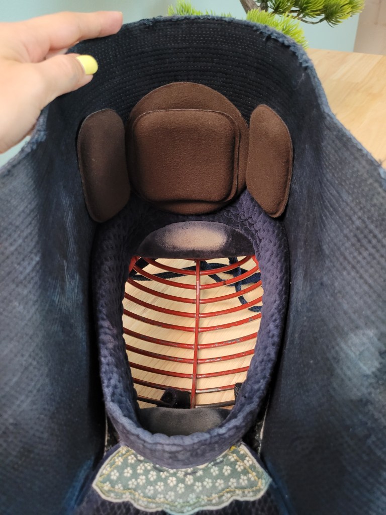 Al recibir un bogu prestado, también me encontré con algunos retos de ajuste. El men que recibí fue diseñado para una mujer con la cara más alargada, así que el mengane (rejilla frontal) no alineaba bien con mis ojos. Lo resolví instalando unos pads interiores: usé un set de pads para casco balístico que ya tenía en casa, y los fijé con velcro y un poco de pega caliente. Ahora el men me queda mucho mejor, y los pads son removibles para poder lavarlos. En mi caso, dos pads en la parte superior fueron suficientes para lograr un buen ajuste.